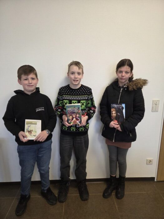 Unsere drei Klassensieger Stella (Klasse 6H), Adrian (Klasse 6R1) und Elina (Klasse 6R2) traten am 19.11.2024 gegeneinander beim Lesewettbewerb an.